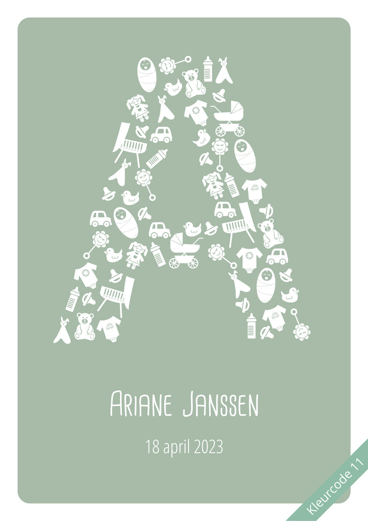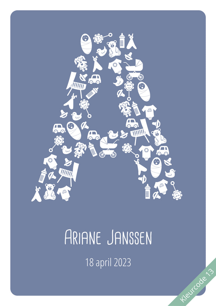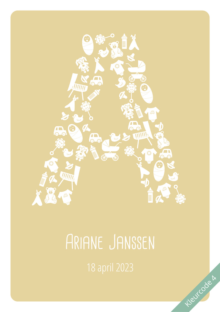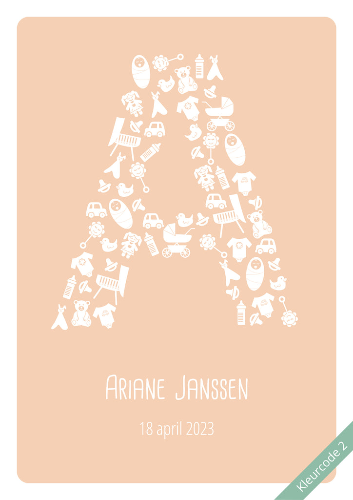 Kies zelf de juiste achtergrond kleur, schrijf dit in de opmerkingen erbij evenals de naam (voornaam & achternaam) en de geboortedatum en je besteld het perfecte kraamcadeau!